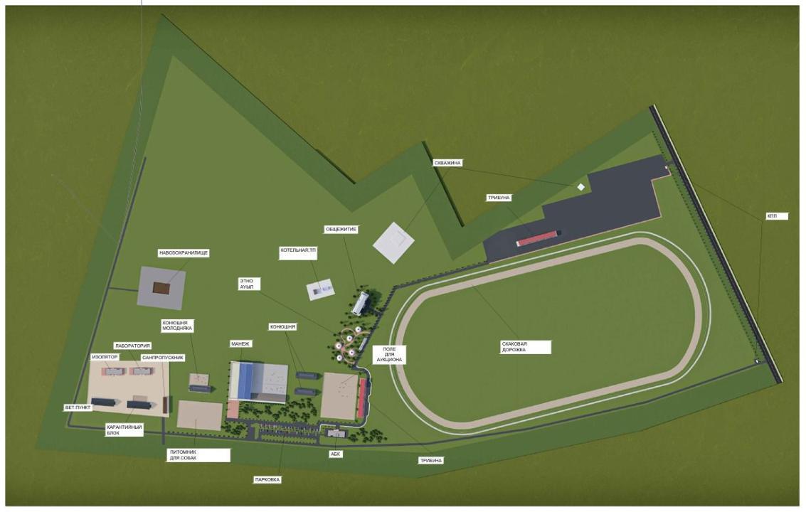 Согласно проектному плану института, на территории комплекса будут размещены манеж, конюшни, ветеринарный пункт, лаборатории и ипподром.